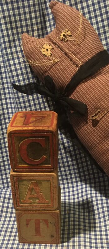 Title (ebay affiliate link): Orig Antique Toy ABC illus Wood C-A-T Blocks w Handmade Cloth Cat Doll FOLK ART