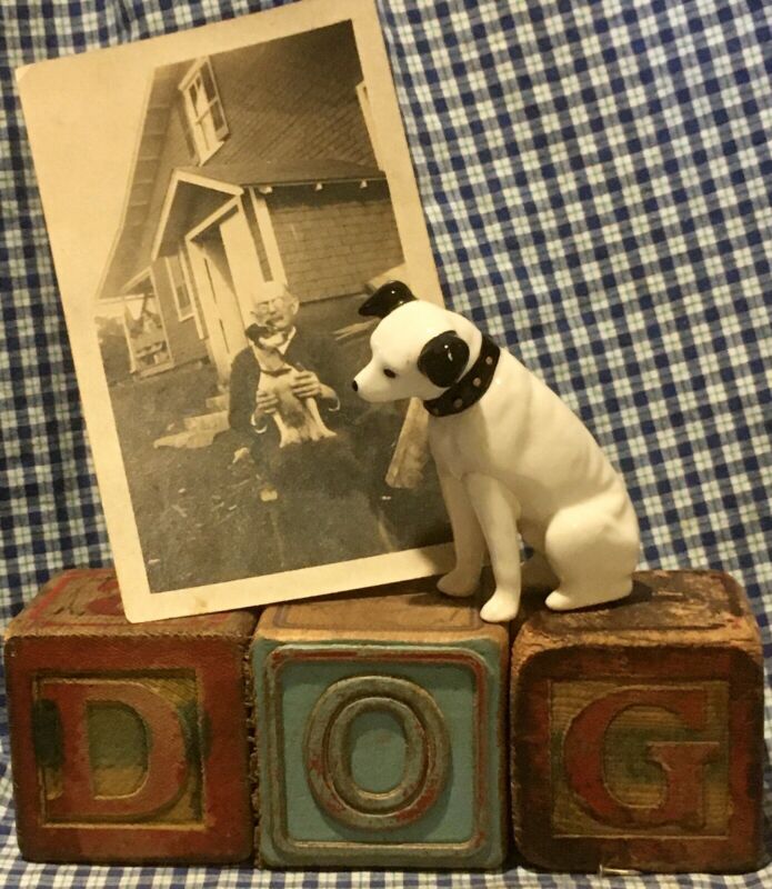 Title (ebay affiliate link): Orig Antique Photo Porcelain RCA NIPPER Dog Figurine w Toy ABC illus Wood Blocks