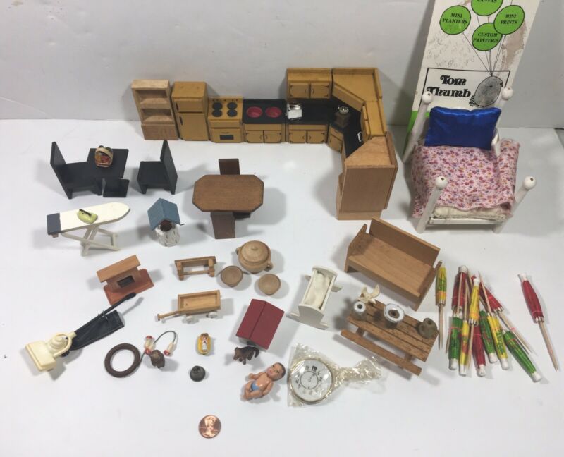 Title (ebay affiliate link): Vintage Lot Wood Doll House Furniture Some Metal Accessories Plastic Tom Thumb