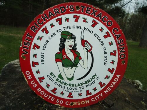 Title (ebay affiliate link): 1959 TEXACO GASOLINE AND MOTOR OIL PORCELAIN GAS STATION SIGN ROUTE 50 CARSON NV