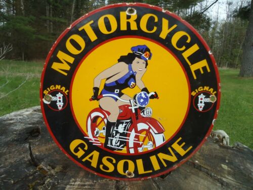 RARE OLD DATED 1948 SIGNAL MOTORCYCLE GASOLINE PORCELAIN GAS SIGN! STOP LIGHT