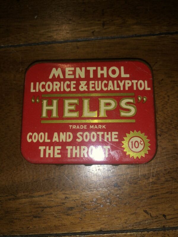Title (ebay affiliate link): Vintage 1930s HELPS Menthol LICORICE & Eucalyptol PELLETS Advertising Tin!
