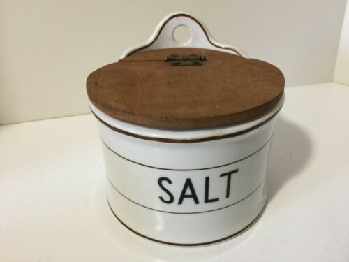 Title (ebay affiliate link): ANTIQUE BUFFALO POTTERY SALT BOX WOODEN LID HANG ON THE WALL