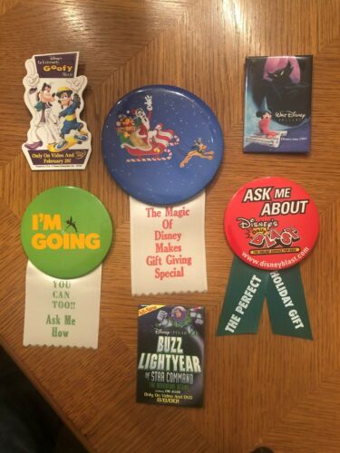 Title (ebay affiliate link): Disney Promotional Pin back Button LOT Some With Promo Ribbons Attached Mickey