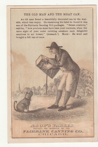Fairbank Canning Aesop''s Fables OLD MAN & MEAT CAN Dog Vict Card c1880s