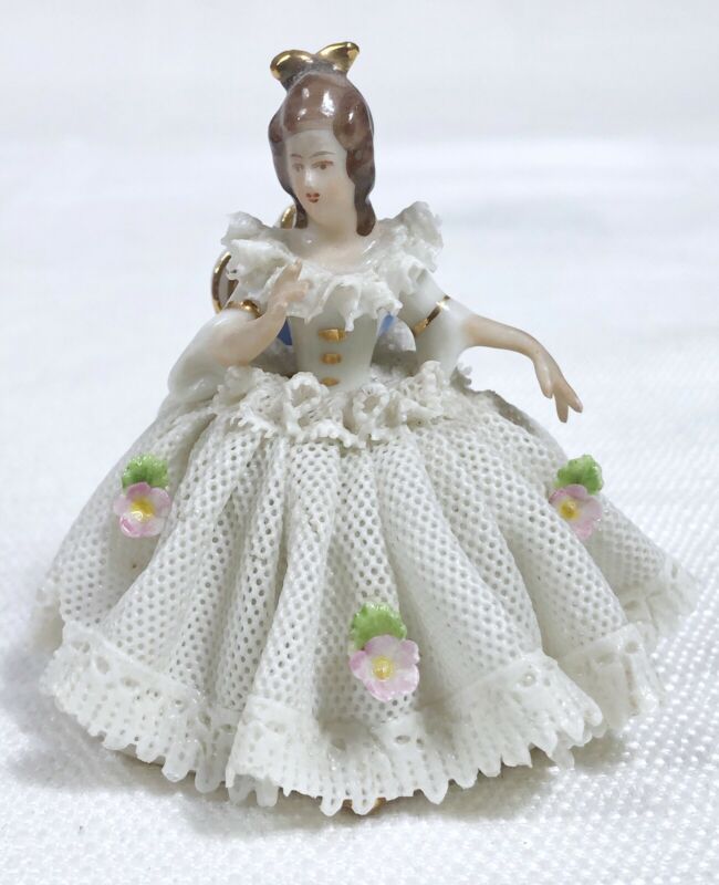 Title (ebay affiliate link): Vtg Mini Dresden German Porcelain Lace Dress Lady On Blue Settee Figure 2-1/2"