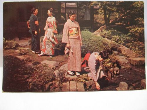 Title (ebay affiliate link): 1954 POSTCARD " GEISHA GIRLS IN THE GARDEN, HOUSE OF THE CRANE, KYOTO JAPAN "
