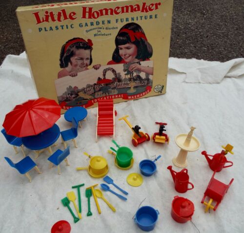 Title (ebay affiliate link): 1947 LITTLE HOMEMAKER GARDEN FURNITURE BY PLASCO 2 sets? Plus pots/pans/tools