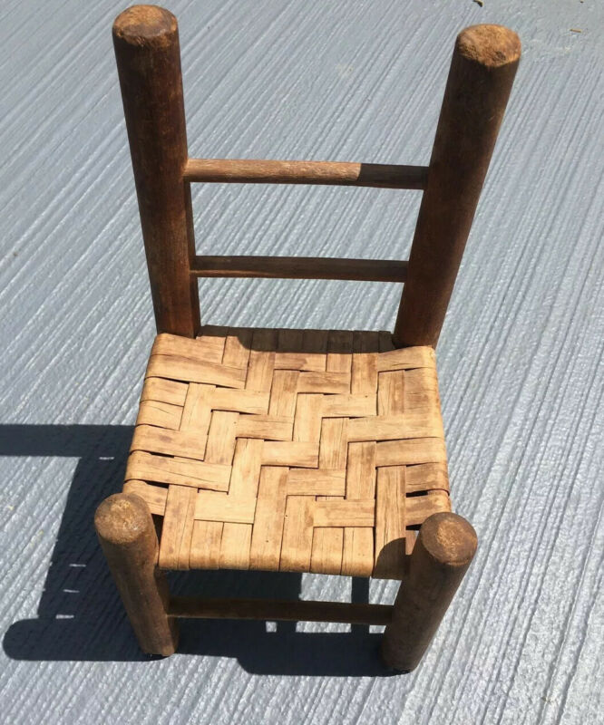 Title (ebay affiliate link): Antique Primitive Folk Art Small Doll Chair Hand Made Wood w/ Woven Seat