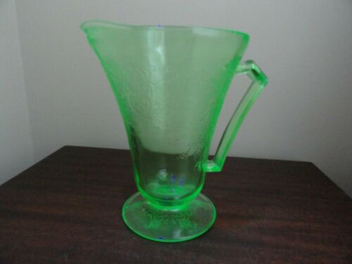Vintage Pitcher Green Vaseline Depression Etched Pressed Glass 3 Cup