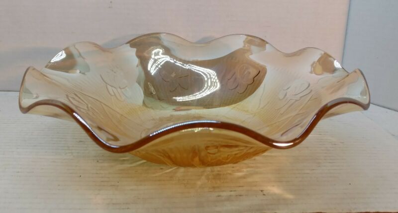 Vintage Jeanette Iris & Herringbone Ruffled Bowl Carnival Glass FloraGold 11 1/2
