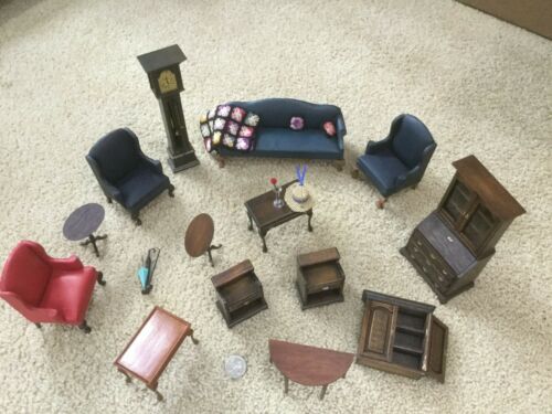 Title (ebay affiliate link): VINTAGE DOLLHOUSE FURNITURE LOT COFFEE END TABLE COUCH CHAIRS GRANDFATHER CLOCK