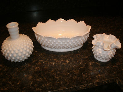 Lot of Three VTG Fenton Hobnail Milk Glass Pieces