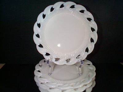 FOSTORIA BETSY ROSS MILK GLASS SET OF FOUR 8" PLATES