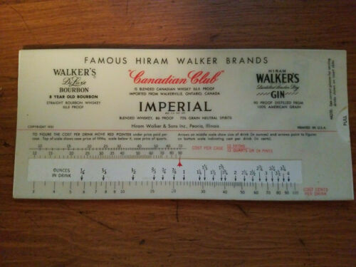 Title (ebay affiliate link): 1951 Hiram Walker, Gin, Burbon, Canadian Club Sliding Cocktail Drink Calculator