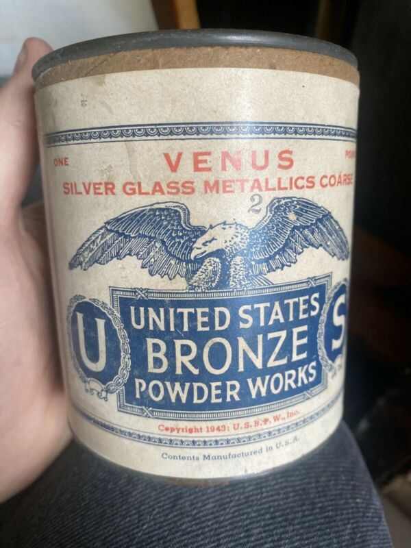 Title (ebay affiliate link): VINTAGE 1943 UNITED STATES BRONZE POWDER WORKS ONE POUND ADVERTISING CONTAINER