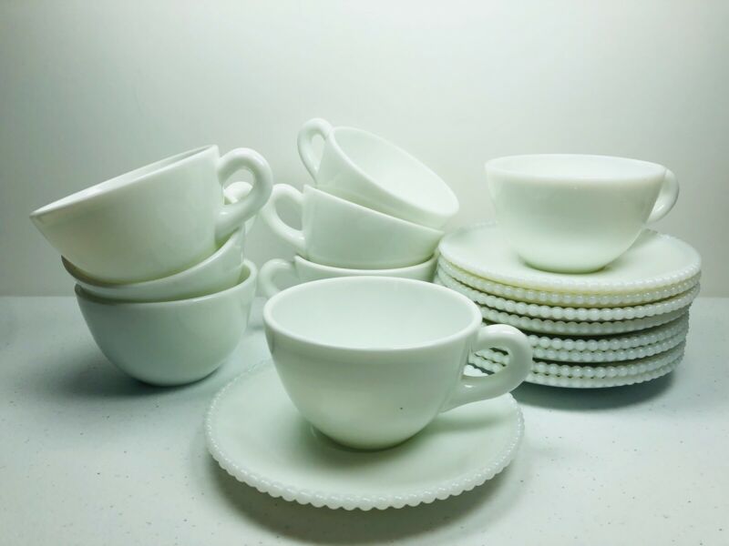 Title (ebay affiliate link): Westmoreland Milk Glass Beaded Edge Cup Saucer Sets SET 8 White USA Vtg RARE