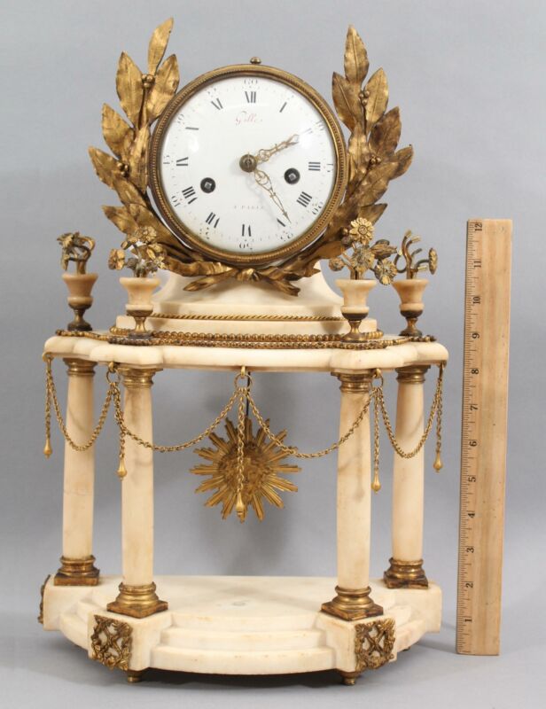 Title (ebay affiliate link): Antique 19thC French GILLE White Marble & Bronze Ormolu Portico Mantle Clock, NR