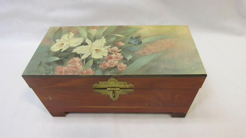 OLDER CEDAR TRINKET BOX w/ FLOWERS & BUTTERFLY