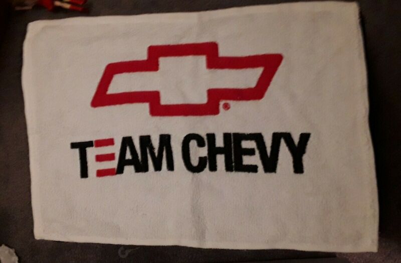 Title (ebay affiliate link): Team Chevrolet white hand towel black & red logo letters 13" x 16" Approximate