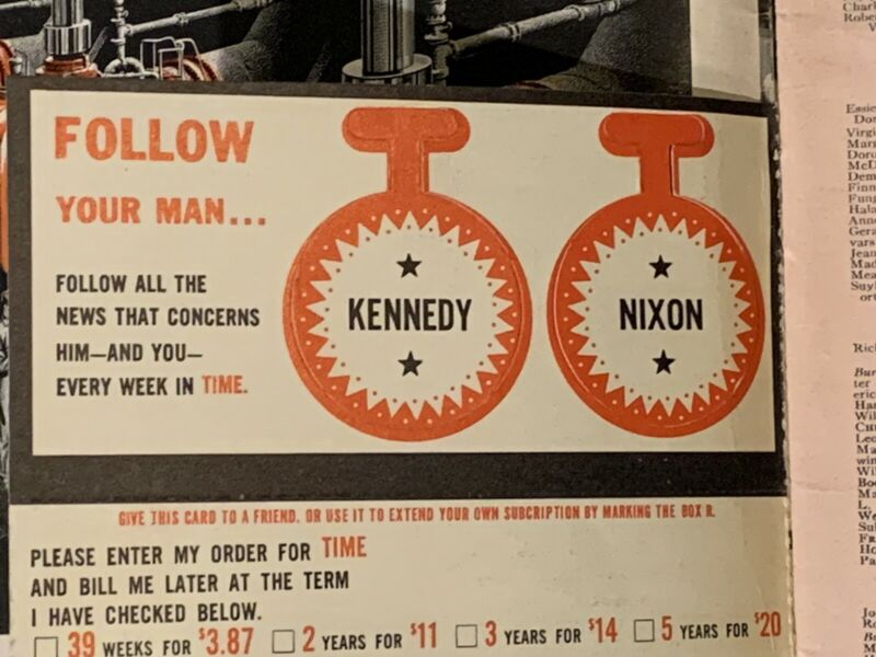 Title (ebay affiliate link): August 22, 1960 TIME Magazine - Nixon and Kennedy Lapel Punch Out Buttons Card