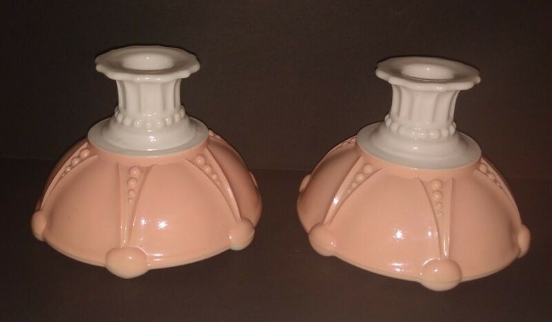 Title (ebay affiliate link): Two Vintage Anchor Hocking PINK & Milk Glass Console Candlestick Candle Holders