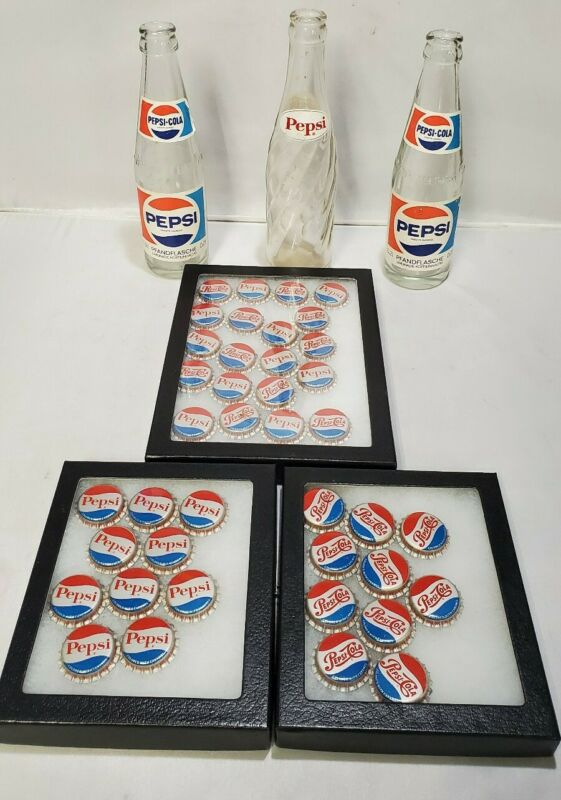 VINTAGE LOT OF 38 PEPSI COLA BOTTLE CAPS UNUSED WITH DISPLAYS and 3 BOTTLES
