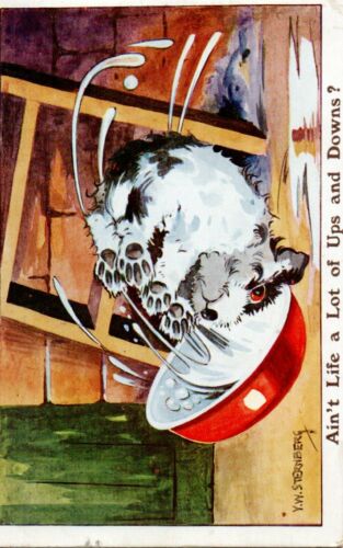 Title (ebay affiliate link): VINTAGE ART postcard: CUTE PUPPY DOG SPILLING BOWL OF MILK by STERNBERG