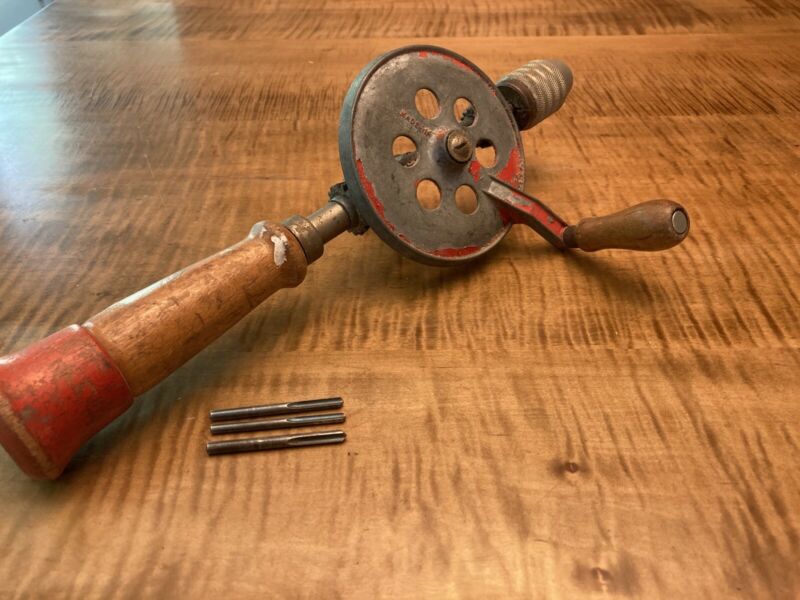 Title (ebay affiliate link): Vintage Hand Crank Drill Metal & Wood Manual Drill Driver Red Egg Beater Style
