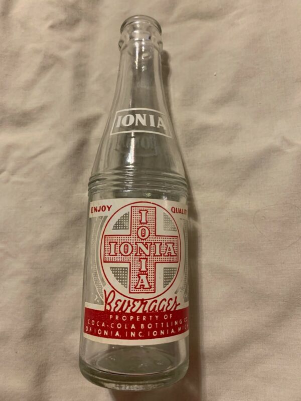 VINTAGE IONIA BEVERAGES BY COCA-COLA ACL 7oz SODA BOTTLE IONIA, MICHIGAN @CLEAN@