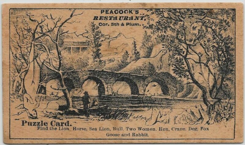 Title (ebay affiliate link): Cincinnati,Ohio-Peacock''s Restaurant-Victorian Trade Card-Hidden Item Puzzle t91