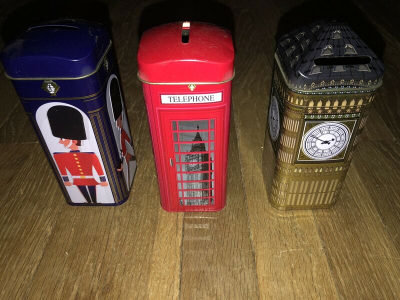 Title (ebay affiliate link): 3-ENGLISH BREAKFAST TEA TINS LONDON ENGLAND COIN BANKS, EMPTY