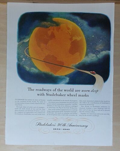 Title (ebay affiliate link): 1942 magazine ad for Studebaker - 90th Anniversary, car goes around the world