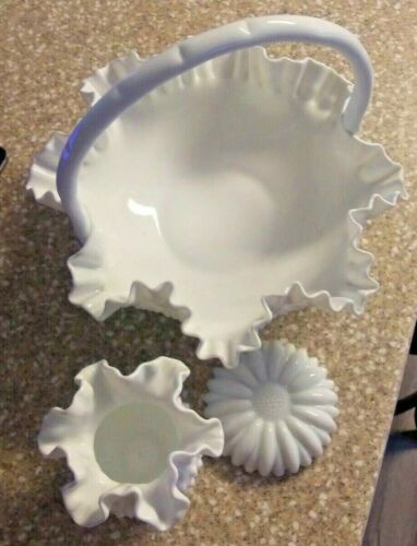 Lot 3 VTG Fenton White Hobnail Ruffled Basket Bowl Vase Crimp Milk Glass Daisy