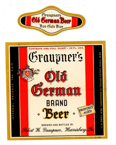 Title (ebay affiliate link): 1930s GRAUPNER BREWERY, HARRISBURG, PA OLD GERMAN 32 OZ IRTP BEER LABEL SET
