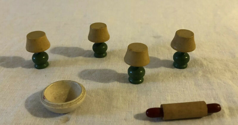 6 VTG Strombecker Dollhouse Furniture Wooden Lamps rolling pin,bowl Accessories