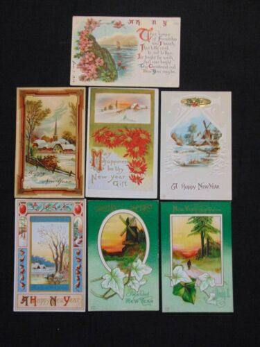 Lot of 7 c1900 Vintage Happy New Year Postcards- scenes, flowers
