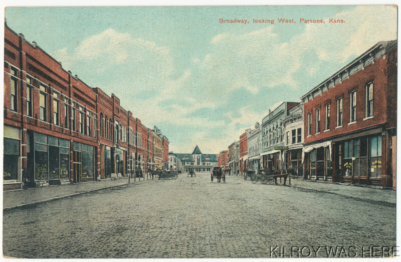 Title (ebay affiliate link): 1909 Postcard Broadway Looking West Main Street Parsons Kansas Stores Buggies