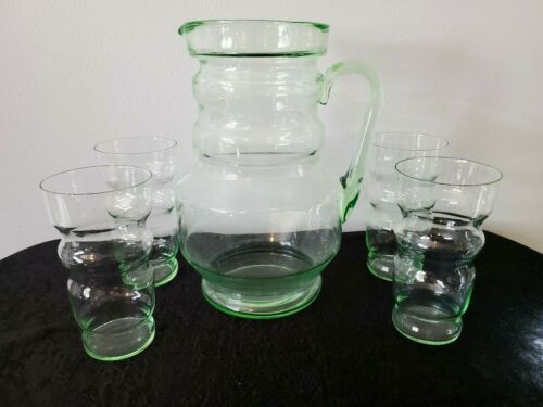 Beautiful Vintage Green Depression PITCHER & 4 GLASS SET, Uranium Glass, RARE !