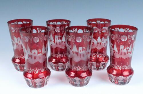 Title (ebay affiliate link): Set 6 Vintage Bohemian Czech Ruby Stained Cut Etched Glasses Tumbler w/ Castle