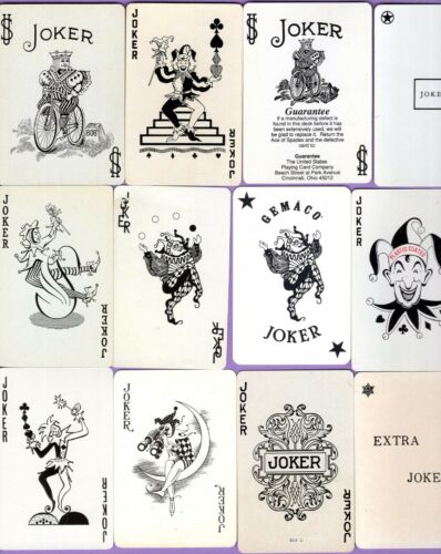 Title (ebay affiliate link): 12 Single Swap Playing Cards JOKERS BICYCLE JESTERS FIGURES ETC B&W SOME VINTAGE