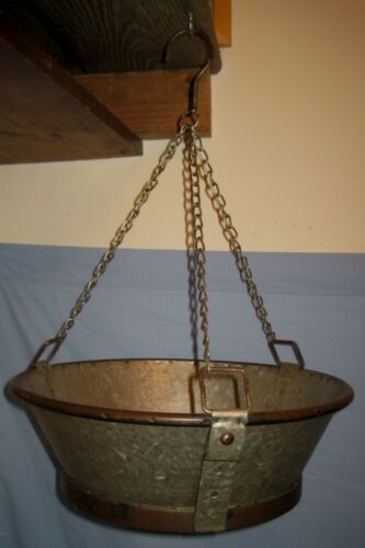 VTG Primitive Rustic Steampunk Hanging Galvanized Round Basket Flowers/Fruit ++