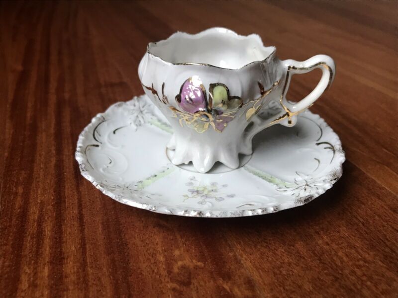 Title (ebay affiliate link): VTG Hand Painted Porcelain Demitasse Cup & Saucer w/ Raised Flower-Accented Gold