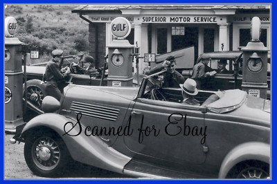 Title (ebay affiliate link): 1934 Gulf Oil gas station Studebakers Pontiac at pump