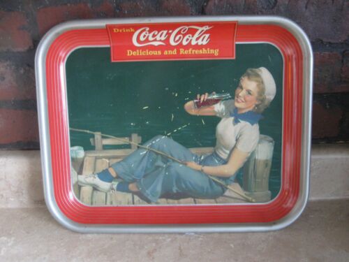 Title (ebay affiliate link): COCA COLA SODA POP ADVERTISING ORIGINAL 1940 TRAY GIRL FISHING WITH SAILOR HAT