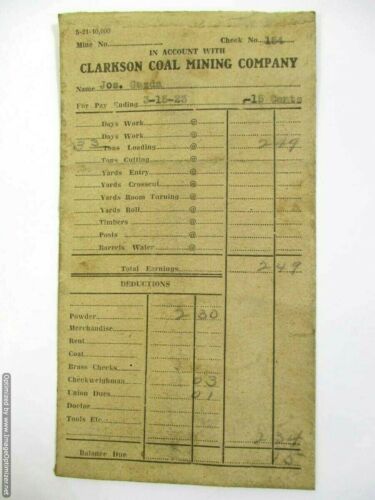 Title (ebay affiliate link): Antique 1923 Miner''s Pay Envelope Card Clarkson Coal Company Belmont County OH.
