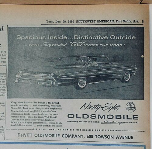 Title (ebay affiliate link): 1960 newspaper ad for Oldsmobile - Olds 98, Spacious inside, Distinctive outside