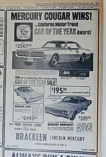 Title (ebay affiliate link): 1967 newspaper ad for Mercury - Cougar Motor Trend Car of Year, Capri, Monterey