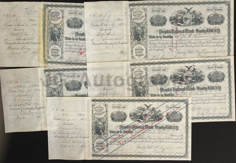 Lot of 5 George Washington Engraved Portrait 1884 People''s National Bank Stocks