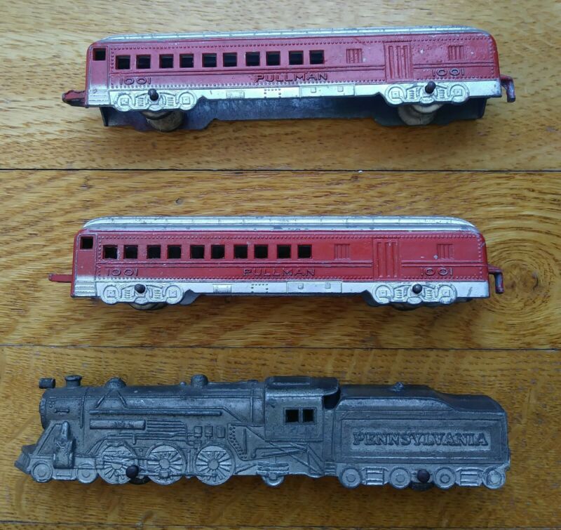 Title (ebay affiliate link): VINTAGE TOOTSIETOY METAL 3 PC LOT STEAM TRAIN & 2 PULLMAN TOOTSIE TOY RAILROAD